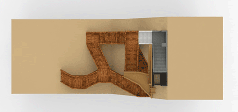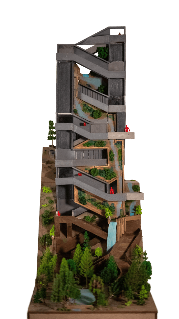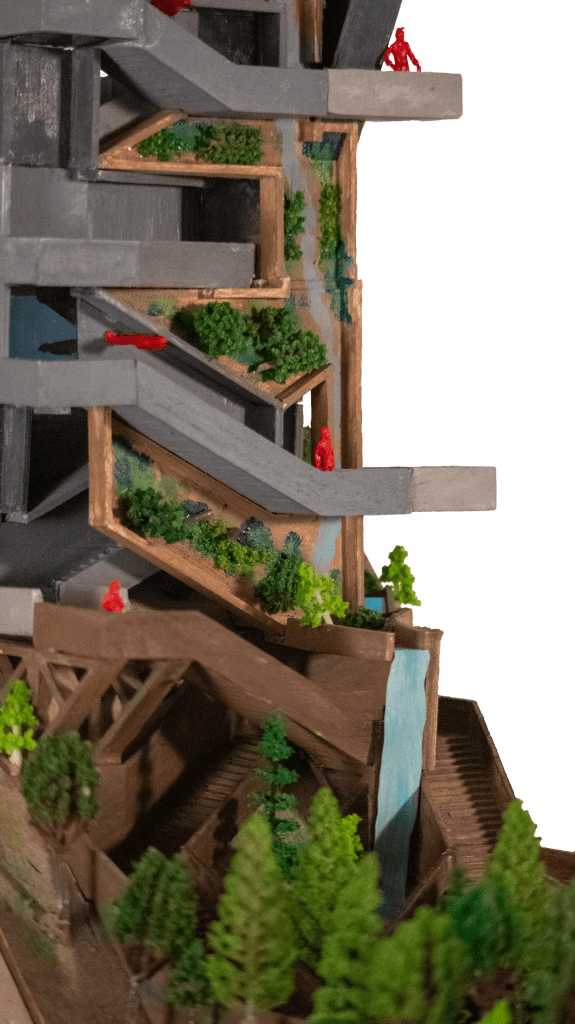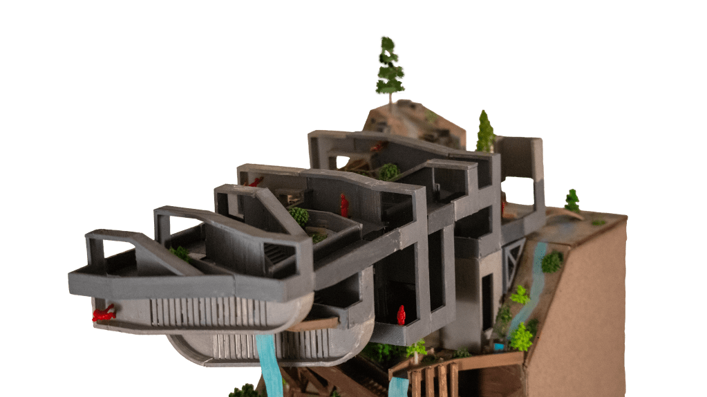 For the detailed physical model I used a 3D printer, laser cutter, and acrylic paint. I engineered a mechanism incorporating counterweights and pivots, allowing for seamless rotation between different orientations. I envisioned the structure nestled within a forested setting with scenic views, complementing the model with trees to show it within the natural environment.